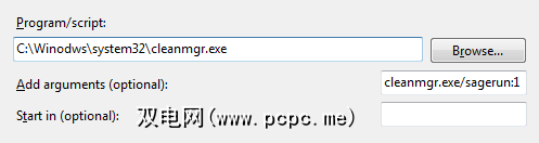 在> Program / script:字段中输入指向相应实用程序的链接。磁盘清理的链接是> C:\ Windows \ System32 \ cleanmgr.exe。 要自动运行该工具而不需要您输入,还可以在>添加参数(选项):中添加命令> cleanmgr.exe / sagerun:1 。