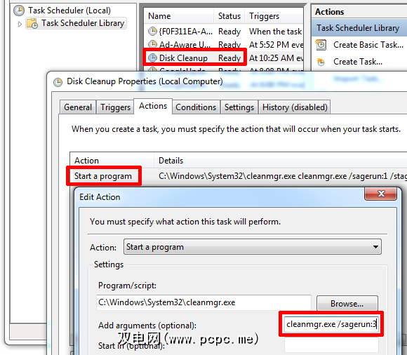 现在返回计划的任务。按照上面的步骤1中所述启动任务计划程序。您的任务将列在“任务计划程序"窗口的顶部中间列中。双击任务,然后切换到>动作选项卡,然后双击>启动程序动作。在>编辑操作窗口中,将> sagerun 命令的编号更改为您的配置文件编号,例如>> cleanmgr.exe / sagerun:3