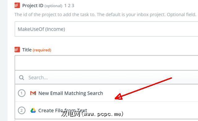 在上面的示例中,新收到的电子邮件是触发器,创建文本文件是先前的操作。在创建ToDoist任务的此步骤中,您可以从传入的电子邮件中提取数据,也可以使用已创建文件中的数据。