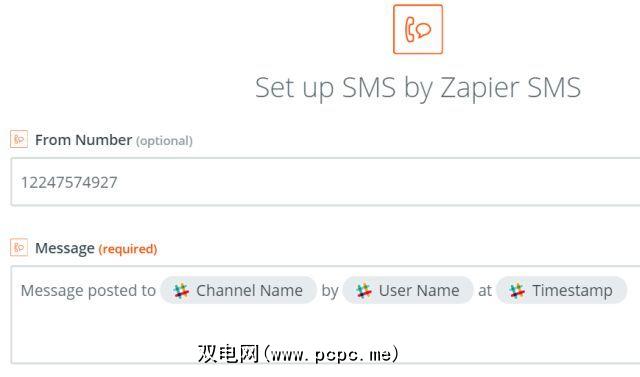我的工作流程的第一步是获取一条包含该人发布到该频道的评论的SMS。再一次,只需使用Zapier Zap的SMS,并使用Slack触发器中的元素来制作SMS消息。