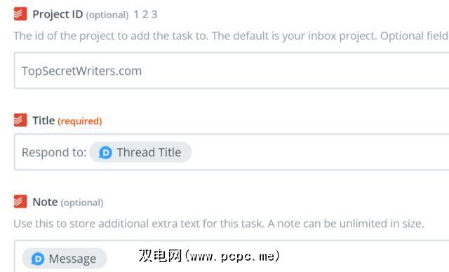 对于第一个“触发",我已经使用了ToDoist Zap,然后将Disqus注释线程标题和注释文本本身传递到ToDoist任务标题和注释中。