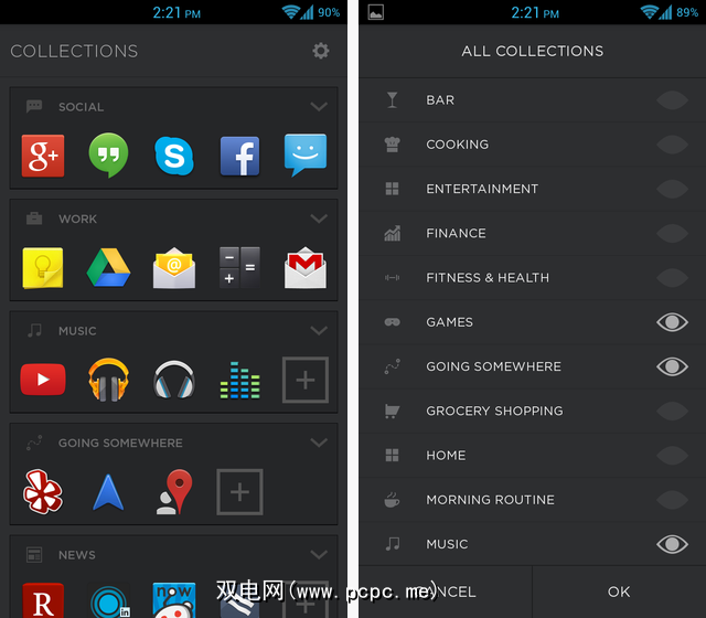 向右滑动,您会看到“集合",这些是基于应用程序的自动整理分组在社交,工作或音乐等方面。您可以通过手动添加或删除应用程序来随意自定义这些组。按下右上角的齿轮,可以隐藏或显示所有收藏集,但是您不能重命名它们或创建新收藏集。