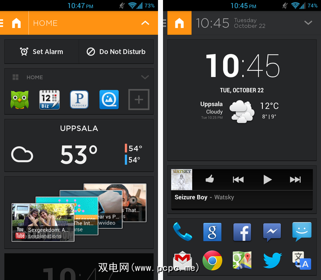 上面可以看到,我在主屏幕上添加了cLock小部件和Google Play音乐小部件,而我的首页下拉菜单中有一个YouTube小部件。每个小部件都显示在自己的屏幕宽度的卡上,以便它们保持独立,并且应用程序保持其一致的用户界面。