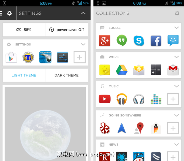 我将启动器保留在“黑暗主题"上,因为我觉得它在眼睛上会更容易一些,但是如果您要使用Google现在风格的Light Theme,该选项在那里。还有一个“省电"选项,当激活该选项时,它会关闭背景同步,WiFi,蓝牙,并将亮度降低到最小值。