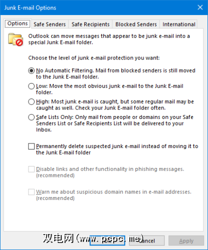 默认情况下,不会出现任何自动过滤,但是如果您设置了任何阻止的发件人,那么它们将被移到垃圾文件夹。您可以将其设置为低以过滤掉明显的垃圾,将其设置为高以捕获大多数垃圾,但也可能会捕获到一些正常的电子邮件,或者将其设置为“仅安全列表" 仅接收您批准的电子邮件。