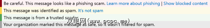 如果您正在运行Office 365并使用Exchange服务器,则会在某些消息的顶部看到彩色的安全提示,以提醒您其内容的性质。这些指示器将显示邮件是可疑的,未知的,受信任的还是安全的。