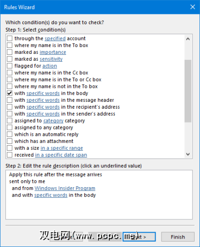 要开始使用Outlook客户端,请转到主页标签,然后单击规则>创建规则... 如果您已经打开了一封电子邮件,则将预先选择一些选项,但是您可以单击高级选项... 来完全自定义规则。首先选择所需的条件,然后单击带下划线的值以指定规则描述。然后单击下一步确定如何处理符合这些条件的任何消息。然后单击完成。