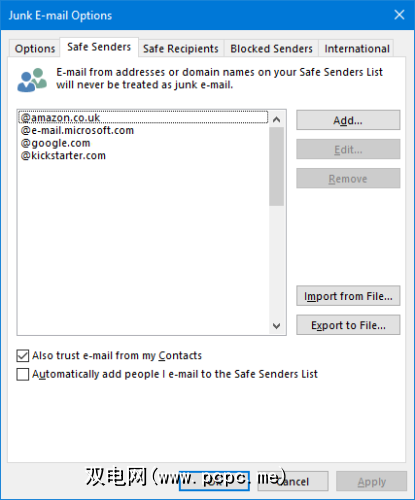 “垃圾邮件选项"窗口也是您可以批准发件人的位置。为此,请转到安全发件人标签。在这里,您可以添加始终希望Outlook信任的电子邮件地址或域。这意味着来自这些发件人的邮件将永远不会发送到您的垃圾文件夹中,并且其中的任何图像都将自动显示。