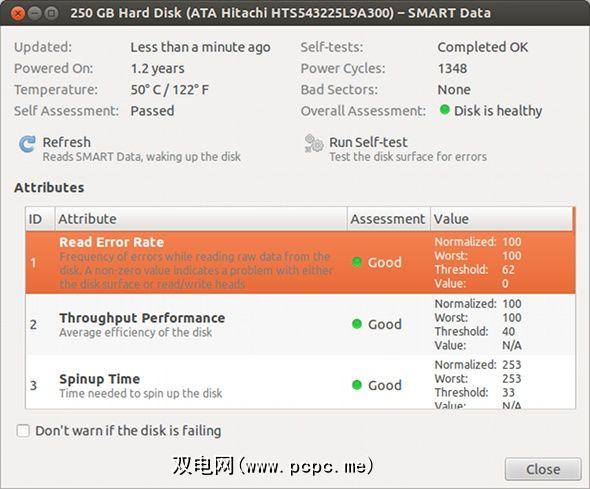 首先,Gnome磁盘实用程序使您可以查看S.M.A.R.T.硬盘驱动器上的数据(硬盘驱动器上的一个特殊区域,用于跟踪硬盘上有哪些可用的功能以及不可用的功能),并告知您是否应该注意一些事项,以防万一您没有注意到任何可操作的问题。您还可以启动硬盘驱动器的自检,因此可以确保S.M.A.R.T.显示的数据是最新且准确的。