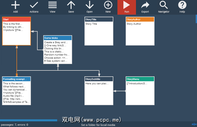 使用导航器来选择菜单和标题,操作来链接或复制项目以及在您运行时运行准备测试您的游戏或故事。您可以切换到源代码模式,导出项目或将其保存到计算机。另外,如果您需要入门方面的帮助,则该应用程序随附快速入门指南以及在线用户手册。