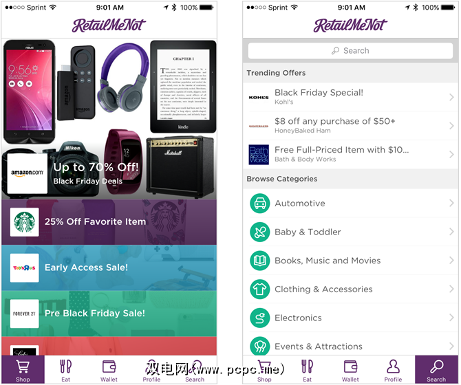 RetailMeNot是另一个拥有大量品牌商店的购物应用程序。在Abercrombie&Fitch,Footlocker,HP和Nortstrom购买。保存您喜欢的商店并查看他们的特惠。当您准备购买时,该应用程序会将您重定向到商店,并协助您应用任何适用的折扣。