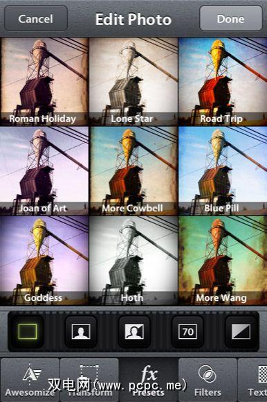 “ Camera Awesome"相机为您提供了大约十二个滤镜预设,并适当地标记了rad名称,例如Rubby Slippers,Trinity,枕头大战和重磅炸弹。在诸如Photoshop之类的应用程序中,要获得这些滤镜效果将需要大量的技能和时间。