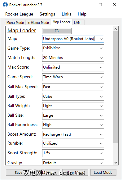 地图加载程序会加载整个火箭联赛地图以及您下载的所有自定义地图。使用“地图加载器"菜单来调整任何增幅器设置,如下图所示。