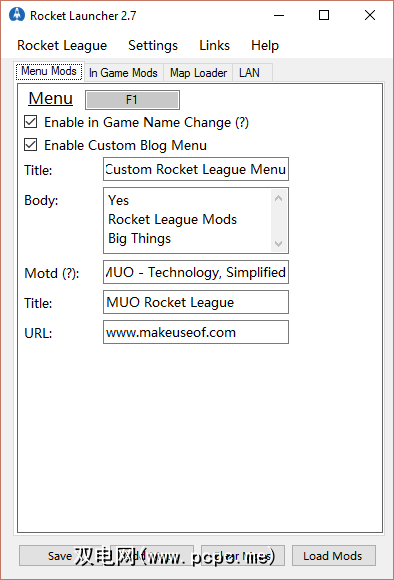 从其页面下载该工具并提取Rocket Launcher。运行该应用程序,然后找到您的火箭联赛目录。共有四个标签,每个标签具有以下选项:菜单Mods ,游戏内Mods ,地图加载器和 LAN
