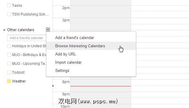 将信息导入Google日历的最快也是最简单的方法是浏览现有的公共日历。您可以通过以下方法执行此操作:单击左侧导航栏中“其他日历"附近的下拉框,然后单击“浏览有趣的日历"。