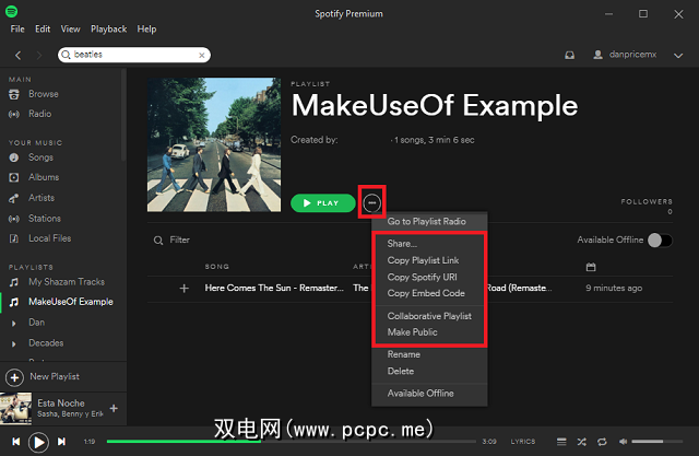 首先,您可以选择制作公开列出。如果您打算使用此列表中的其他一些工具共享它,请使用此选项,但是请注意,任何人都可以使用Spotify的搜索功能找到它。