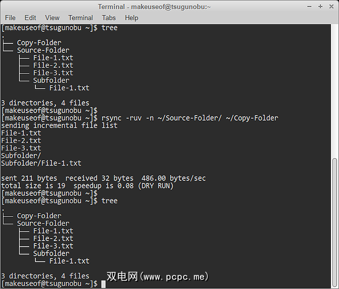 如上图所示,实际上没有文件传输。但是,您仍然可以看到如果省略 -n 选项将会发生什么情况。因此,在rsync中进行空运行是非常快速和容易的预防步骤,尤其是当您使用许多链接在一起的选项时。