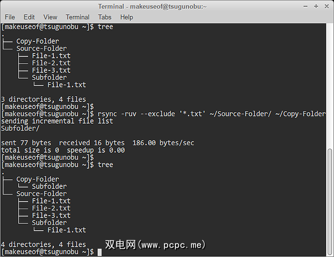 此命令意味着rsync会忽略所有以.TXT结尾且仅沿文件夹复制的文件。 * 符号用作通配符-它代表您可以命名TXT文件的所有可能的单词和字母。这是rsync的基本排除模式。