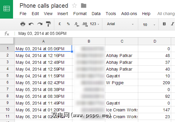 就是这样。现在,每次您使用Android智能手机拨打电话时,都会自动将其作为备份连续备份到Google云端硬盘中的电子表格文件中,如下所示: