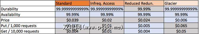 每个类别中最好的部分用蓝色标记。 耐久性是您丢失文件的可能性很小。除了减少冗余之外,在丢失数据之前,亚马逊将不得不在两个数据中心遭受灾难性的损失。基本上,AWS将把您的数据存储在除简化冗余类之外的所有类的所有设施中。 可用性是停机的可能性。其余的将通过示例更容易地演示。