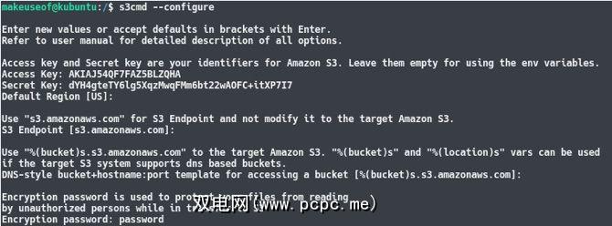 s3cmd --configure现在将提示您输入一些详细信息。首先,将提示您输入访问密钥ID,然后输入您的秘密访问密钥。只需按下Enter键,即可将所有其他设置保留为默认设置,但加密设置除外。您可以在此处选择一个密码,以便对进出S3的数据进行加密。这样可以防止中间人攻击或拦截您的Internet流量。