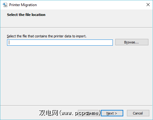 选择从文件导入打印机队列和打印机驱动程序。单击下一步,然后单击浏览... ,然后找到您之前创建的备份文件。单击下一步。