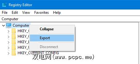 要备份整个注册表,请在左侧窗格的计算机上右键单击,然后单击导出。导航到要保留备份的位置,输入文件名,然后单击保存。