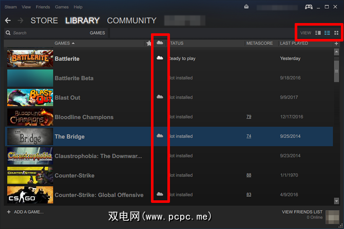 要查看哪些游戏支持Steam Cloud,请转到“库"页面,然后单击列表视图。支持此功能的游戏带有云图标: