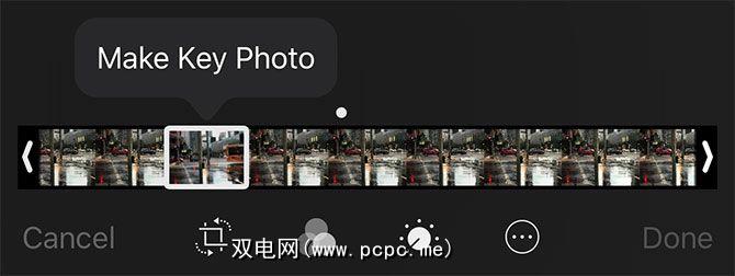 如果点击<在右上角的“ strong>编辑",您会在屏幕底部看到一个胶卷。在这里,您可以从实时照片数据中选择新的关键图像。点击一个框架以将其选中,然后点击制作关键照片。