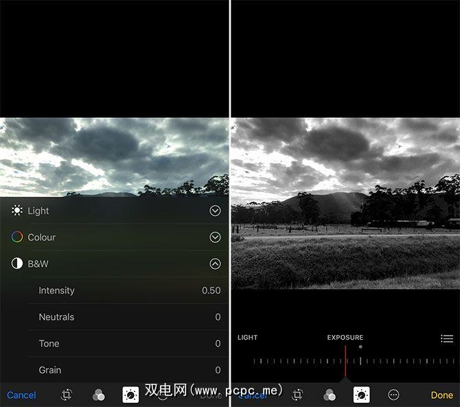 注意:在黑白模式下工作时,您对“灯光"控件所做的任何更改(对比度,高光和阴影等)都将保留。