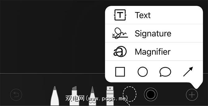 Apple提供了一系列不错的工具。从左到右分别是:标准笔工具,荧光笔,铅笔,用于删除标记的橡皮擦,用于移动标记的选择套索以及颜色选择器。