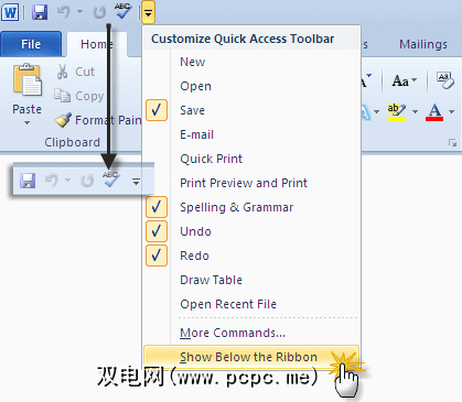 如果工具栏的默认位置对您和您的顶峰有点偏视线高度,可以将其移动到功能区下方。单击向下箭头(“自定义快速访问"工具栏),然后单击“ 在功能区下方显示" 。