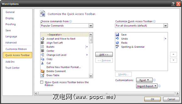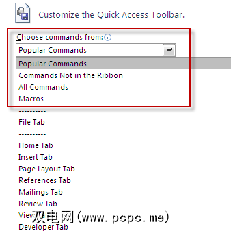 显示“快速访问工具栏"选项。此对话框包含您可以期望为该特定MS Office程序找到并使用的所有命令的主列表。右边的框显示工具栏上当前的命令。