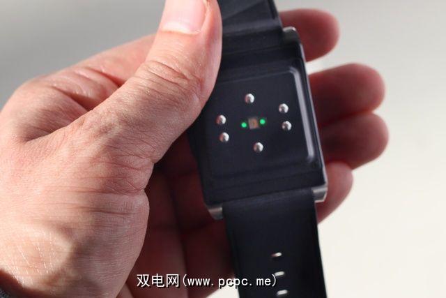 基础B1 Health Tracker覆盖有各种螺柱和绿色LED。触摸多个电容式螺柱会触发LED。我以为,当后部接触裸露的肉时,它会以频闪状的模式照亮LED灯。