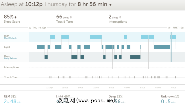 “数据"部分使用户可以访问更为详细的运动统计数据。它还包括Basis的睡眠跟踪数据,可以告诉用户他们的睡眠质量。睡眠数据包含四个主要指标:深睡眠,浅睡眠和 REM (快速的眼动)睡觉。利用其加速度计,Peak还可以确定用户在睡觉时移动了多少次。运动往往在轻度睡眠期间最常见,尽管它也发生在REM睡眠期间(因为用户梦见REM)。