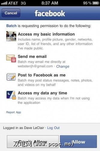 与Facebook和Twitter共享批次就像打开屏幕底部的共享按钮一样容易。对于Twitter,您将必须输入用户名和密码,但对于Facebook,它将已经存在,因为首先必须与Facebook链接到应用程序。