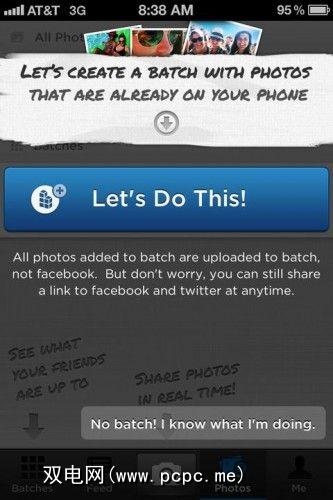该应用程序提供了一些快速教程,可以指导您完成创建和分享您的第一个批次。您可以通过单击屏幕底部标题为“ No Batch!"的巧妙链接来跳过此操作。本教程很快。只是选择几张照片,进行批处理并共享。