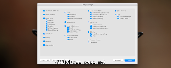这将弹出“ 复制设置"面板。使用复选框或全部选中和不选中按钮选择要复制的设置。如果您尚未进行特定的单个图像更改,通常可以毫无问题地进行复制。