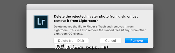 Lightroom会要求您确认是否要从Lightroom中删除照片,或将它们从磁盘上完全删除。我个人喜欢从磁盘上删除它们,因为我有多个备份,并且不需要保留不良照片,但是您的选择可能会有所不同。