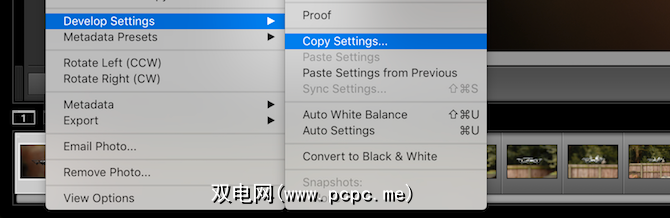 进行基本修改后,应将其应用于系列中的所有图像。保持选择的图像不变,右键单击并转到“开发设置">“复制设置" 。