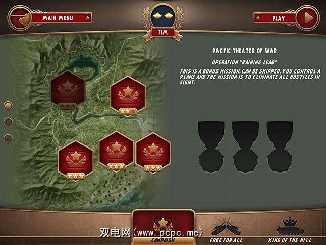单人游戏主要由三个战场之一的战役主导:太平洋,法国和俄罗斯。每个剧院都有四个难度不同的等级,还可以选择解锁额外等级。游戏的大部分内容涉及在坦克的小村庄中穿行,对敌人的火炮射击,同时努力避免过多的炮弹射击。