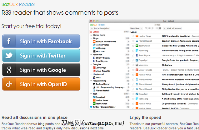 您需要使用以下一种登录到BazQux上-Facebook帐户, Twitter帐户,Google帐户(供那些讨厌社交媒体的人使用)或OpenID帐户(人们仍在使用OpenID吗?)。完成后,您将被直接带到主屏幕以开始30天免费试用。