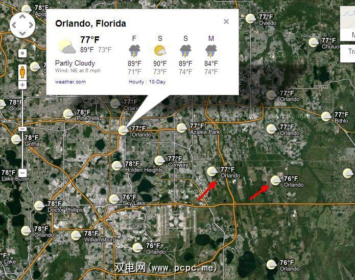 Google地图中另一个用于计划行程的有用功能是天气层,您可以通过单击右上角地图图标下的,然后选择天气层来启用天气层。您会看到的是一个相当凉爽的温度网格,并且在您要访问的区域中的每个主要城市或城镇上都有很少的天气条件图标。