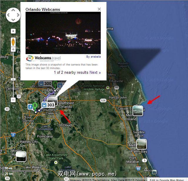 执行此操作后,您将在地图顶部看到所有可用的网络摄像头。单击其中任何一个,将显示该区域中实时网络摄像头的快照。这是一种查看一天中特定时段人群的大小的好方法,或者只是查看某个区域以查看它是否如您期望的那样好。