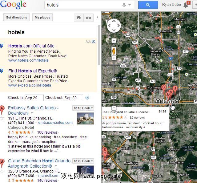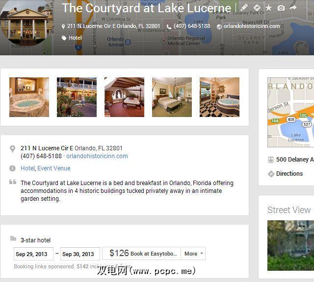 Google地图绝对是我最喜欢研究的最佳住宿地点。在规划奥兰多的旅途中,我去了佛罗里达州奥兰多市的Google地图,然后在搜索字段中键入“ hotels"。该地区所有酒店都作为位置标记显示在地图上,并且在左窗格中,您将找到每个酒店的地址,电话号码和评论。