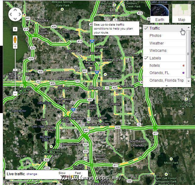 如果您在旅途中开车穿越城市,则需要检查的第一件事外面是交通层。您只需单击右上角的“地图"图标并启用“流量"选项即可启用该视图。