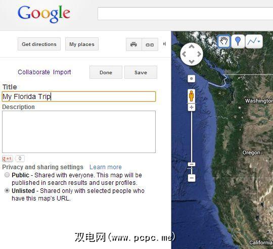 更改下拉菜单中的“正在创建新地图…",然后单击“保存"按钮。这会在“我的位置"下创建一个新地图,您将在左侧窗格中看到拥有您的Google地图旁边的新地图。您可以将地图重命名为自己喜欢的任何地图,也可以将其公开提供给任何在线用户,也可以将其保留为不公开的私人地图。