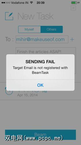 现在,对于双方来说,安装该应用并使用电子邮件地址进行注册至关重要。该电子邮件地址将用作Beamtask ID。因此,例如,当您想向我分配任务时,您需要将该任务发送到我用来注册的电子邮件地址,该电子邮件地址会显示在我的列表中。但是,如果使用的电子邮件未在Beamtask上注册,您将看到如下错误消息: