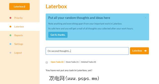 生产力哲学是主观的。但是其中一些起飞并流行起来,因为许多人似乎发现它们易于实现。 Laterbox是一个新的待办事项列表Web应用程序,它基于基本的生产力原则,结合了工作流的最佳想法来完成任务。