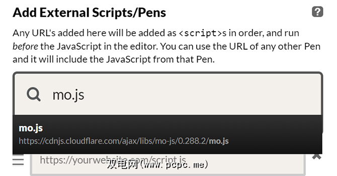 我们还需要导入mo.js库进入项目。为此,请在添加外部脚本/笔文本提示中搜索 mo.js ,然后选择它。